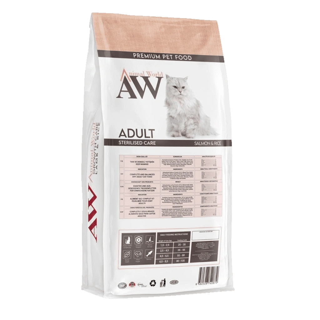 Animal World Somonlu Kısırlaştırılmış Kedi Maması, ideal kilonun korunmasına yardımcı olmak amacıyla kalori seviyesi düzenlenmiştir. Kısırlaştırılmış kediler için özel olarak formüle edilmiş olup, somon eti ve pirinç gibi hayvansal kökenli proteinler ve az miktardaki yağ içeriği ile kilo kontrolünü sağlayan tam ve dengeli bir kedi mamasıdır. Yaşlanmaya karşı etkiye sahiptir ve serbest radikalleri temizleme özelliği ile vücudun doğal savunma sistemini güçlendirir. Etkili sindirim ve besin maddelerinin emilimini artırmak için yüksek kaliteli ham maddelerden üretilmiştir.