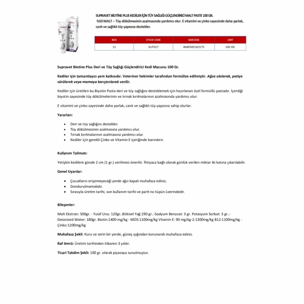 Supravet Biotin Plus Kediler için Tüy Sağlığı Güçlendirici Malt Paste 100 gr