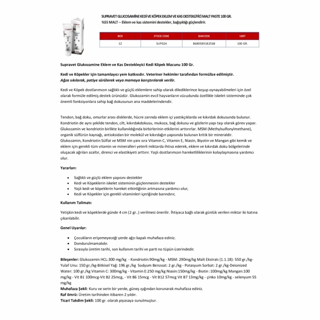 Supravet Glucosamine Kedi ve Köpek Eklem ve Kas Destekleyici Malt Paste 100 gr