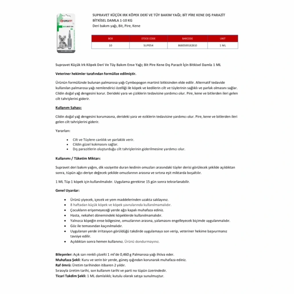 Supravet Küçük Irk Köpek Deri Tüy Bakım Bit Pire Kene Dış Parazit Damla 1ml